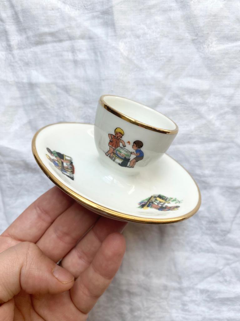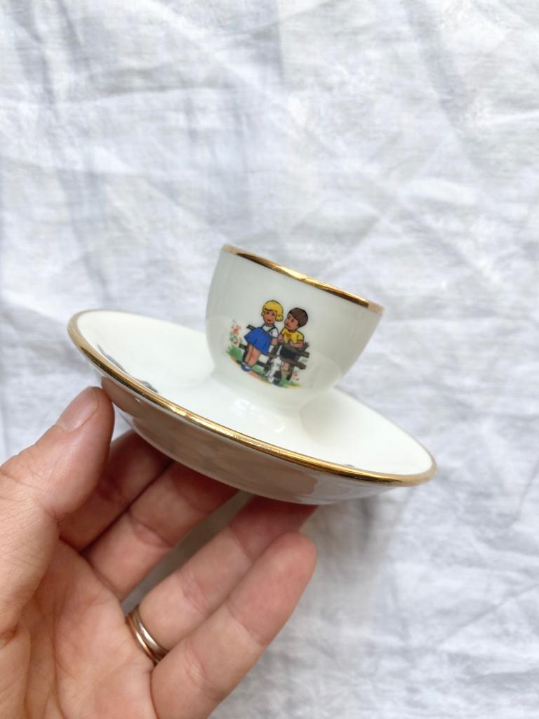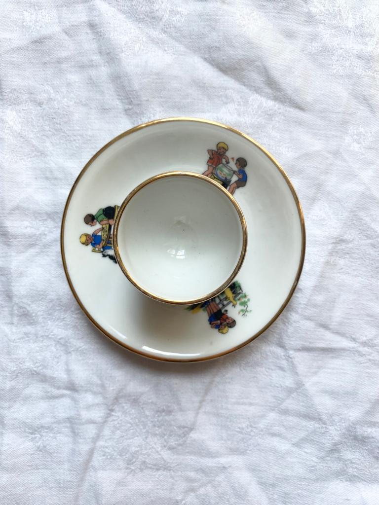 Coquetier en porcelaine française à décor d'enfants et à liseré doré